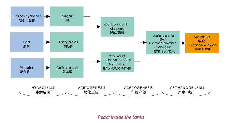 The process of biogas production in a biogas digester involves parallel steps occurring both temporally and spatially within the digestion tank. The overall rate of the decomposition process is determined by the slowest reaction chain.
